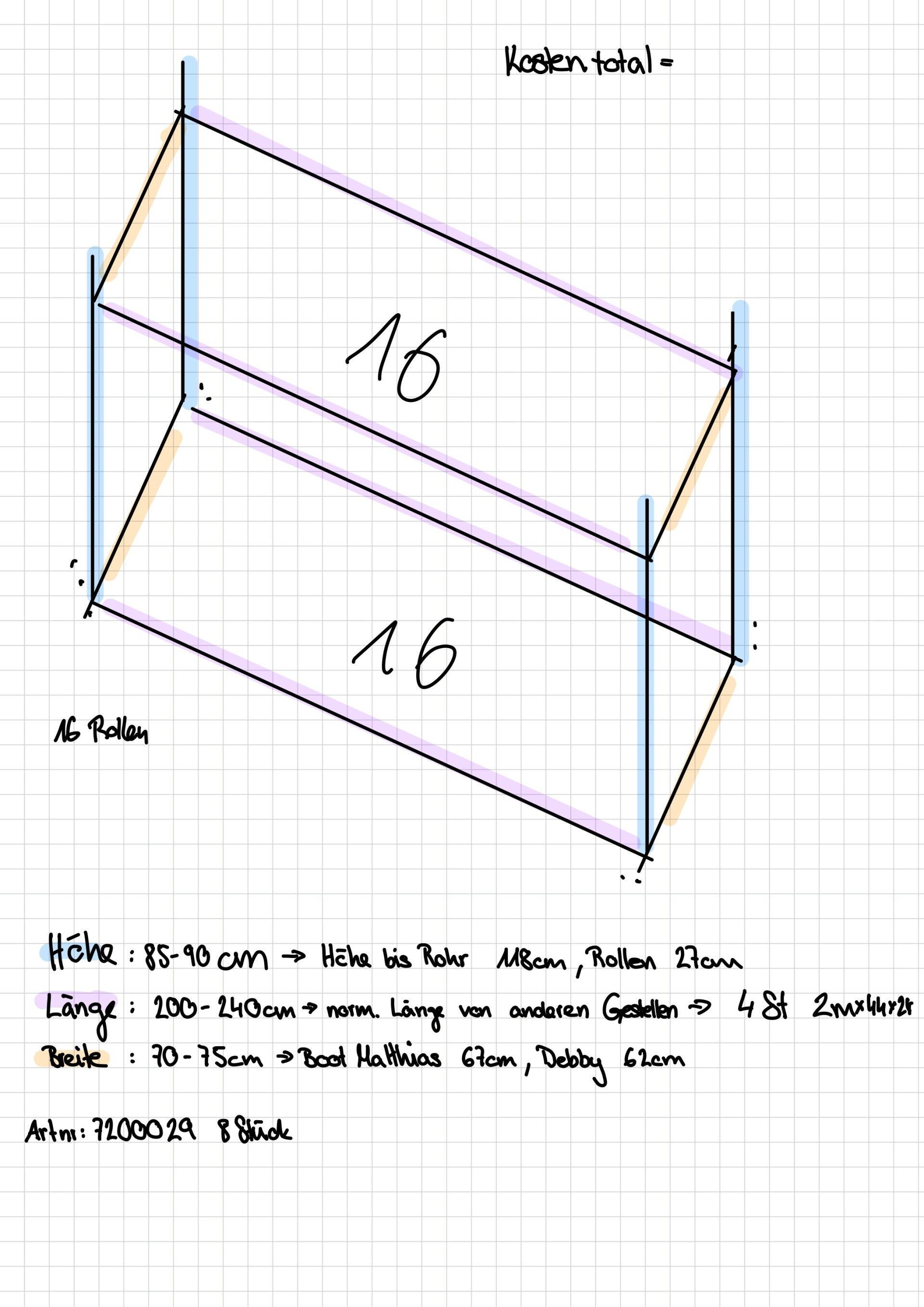 Erster Schritt: Ausmessen. Wir mussten den verfügbaren Platz genau bestimmen – besonders, da uns einige Rohre in der Garage in der Höhe einschränken. Dazu brauchten wir auch die Maße der Kajaks, um präzise planen zu können. Mit diesen Daten erstellten wir eine Skizze, die du unten im Bild sehen kannst. Unsere Entscheidung fiel auf eine einfache Ablage mit Rädern, damit wir die Kajaks flexibel bewegen können. Die Konstruktion sollte 200 cm lang, 90 cm hoch und 70 cm breit sein. Nach einem Besuch im Baumarkt kehrten wir mit 8 Brettern à 2 Meter, 36 Schrauben (4,5 mm x 70 mm), 4 Rollen mit Bremsfunktion und 16 passenden Schrauben zurück. Die Materialkosten lagen bei etwas über CHF 100.-. Jetzt konnte der Bau beginnen!